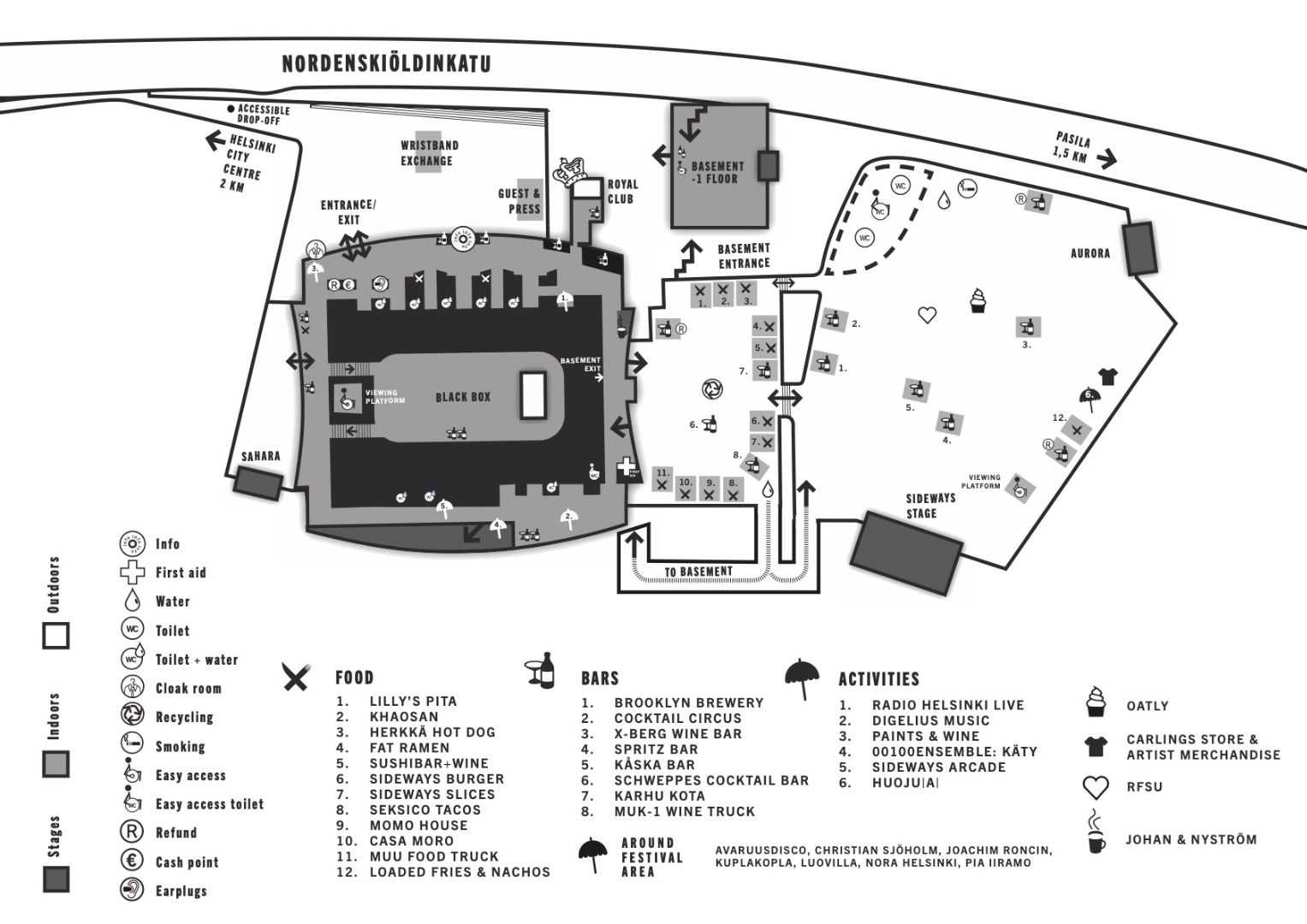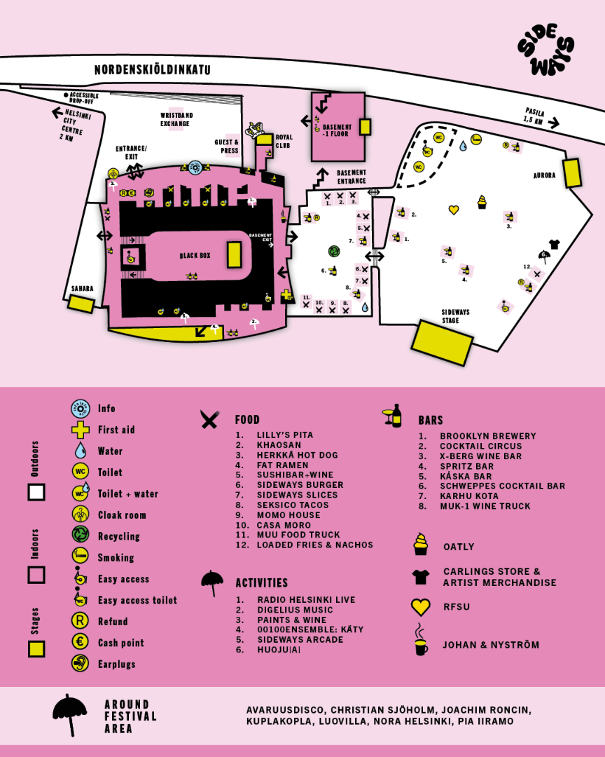 Sideways-alue on pääosin tasaista betoni- tai asfalttipohjaa, mutta Nordikselta löytyy myös portaita sekä kellarikerroksessa sijaitseva keikkapaikka Basement. Kaikkiin tapahtumapaikkoihin on esteetön kulku, mutta kulkureitit poikkeavat osittain muun yleisön reiteistä. Suosittelemme varaamaan riittävästi aikaa siirtymiin. Alueella on jonkin verran kynnyksiä, mutta jokaisen oviaukon lähettyviltä löytyy järjestyksenvalvojia, jotka auttavat tarvittaessa niiden ylittämisessä.
